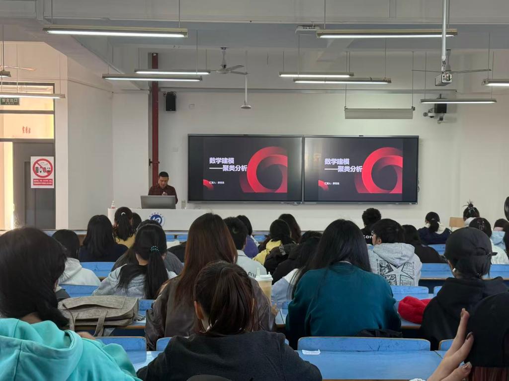 围绕聚类分析,他梳理了该方法发展脉络:20世纪初,统计学的发展推动研究者尝试用数学和统计方法对数据分组;1960年代,计算机的普及为大数据处理提供了工具,数据集规模快速增长,系统聚类方法等基本算法也在这一时期应运而生。通过清晰明了的讲解,将聚类分析的发展背景、核心原理与实际应用紧密结合,让在场学生对这一数学建模方法有了更系统的认知,结合实际案例,将聚类分析的核心原理、应用场景与实操技巧逐一拆解,让抽象的数学建模知识变得通俗易懂,现场学习氛围浓厚。