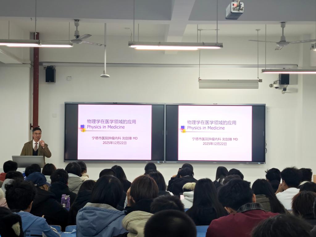 为拓宽数理学子专业视野,探索物理学与医学交叉领域的应用价值,12月22日我院特邀附属医院肿瘤内科执行主任刘剑锋教授在CC301教室开设《物理学在医学领域的应用》专题讲座。学院师生共同参与了本次讲座。
