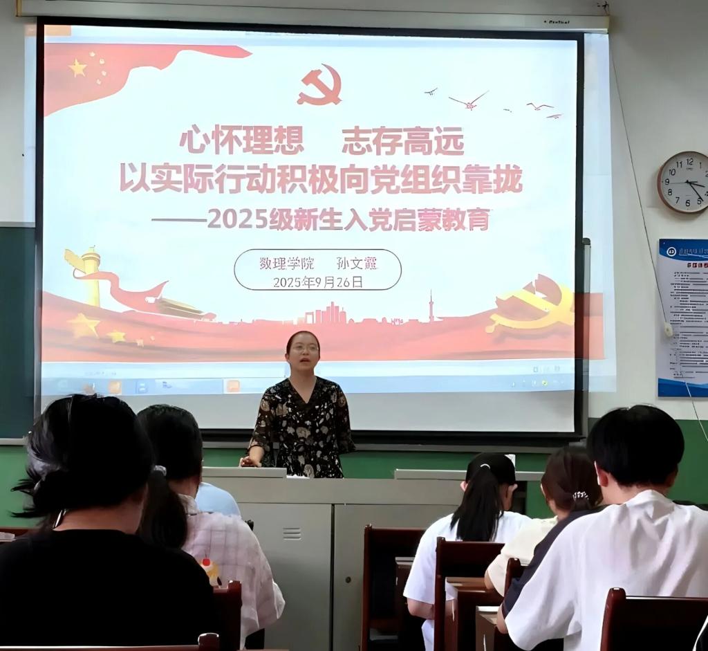 为帮助新生扣好入党启蒙的“第一粒扣子”,9月23日至26日,数理学院在东侨校区求实楼A301、蕉城校区21号楼501教室举办《心怀理想 志存高远,以实际行动积极向党组织靠拢》新生入党启蒙教育专题讲座。讲座由学院专职组织员孙文霞主讲,2025级物理学、数学与应用数学专业全体学生参加。