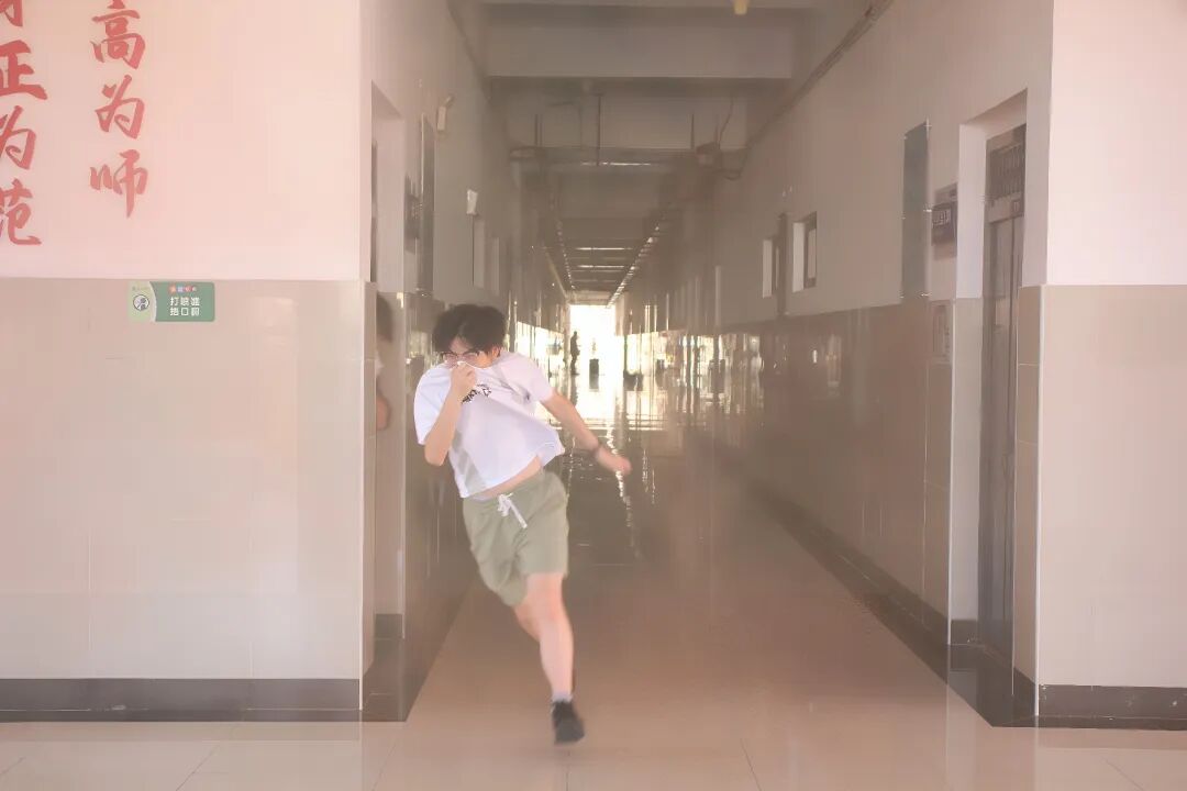 下午15时30分,消防警报准时响起,演练正式开始。师生迅速行动,用湿毛巾捂住口鼻、保持弯腰低姿,严格遵循预定疏散路线,快速且有序地向指定安全区域撤离。各楼层疏散引导员全程坚守岗位,实时指挥疏导人流,及时纠正不规范动作,有效保障了整个疏散环节高效、安全、无拥堵。