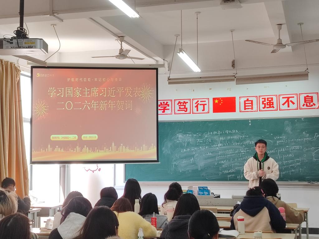 班会伊始,同学们集体观看了习近平总书记发表的二〇二六年新年贺词视频。贺词全面回顾了过去一年国家建设取得的重大进展,生动描绘了未来发展的蓝图,对广大青年寄予了深切期望。随后,紧扣“科技创新”“文化传承”“绿色发展”等关键词,大家探讨如何在信息化、智能化浪潮中找准自身定位、练就过硬本领,纷纷表示,国家的发展为青年成长成才搭建了广阔舞台,新时代青年学子要将贺词精神内化于心、外化于行,立志用所学知识服务社会,在奋斗中实现青春价值。